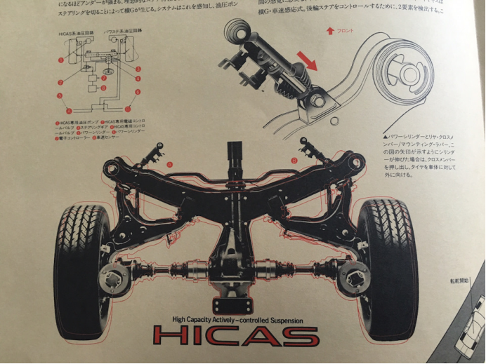 HICAS系统的机械结构其实并不复杂,这套装置安装在半拖曳臂悬挂结构的安装后下摇臂的横梁两端,通过两个小型液压驱动器驱动横梁、带动整个后悬挂机构发生偏转实现后轮转向,液压驱动器由电脑控制,虽然刚诞生时并没有反向角设计,但在后来的Super HICAS上已经加上。