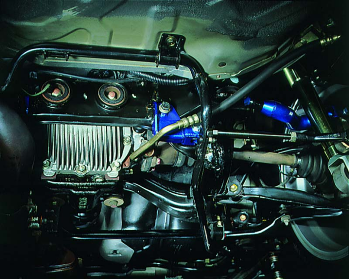 图:使用了CUSCO同类产品的GT-R33,后副车架后方的Super HICAS伺服机构已经拆除,另外在行李舱夹层中的控制电脑等也可以一并拆除。