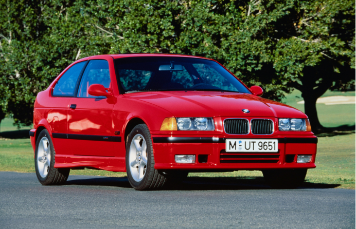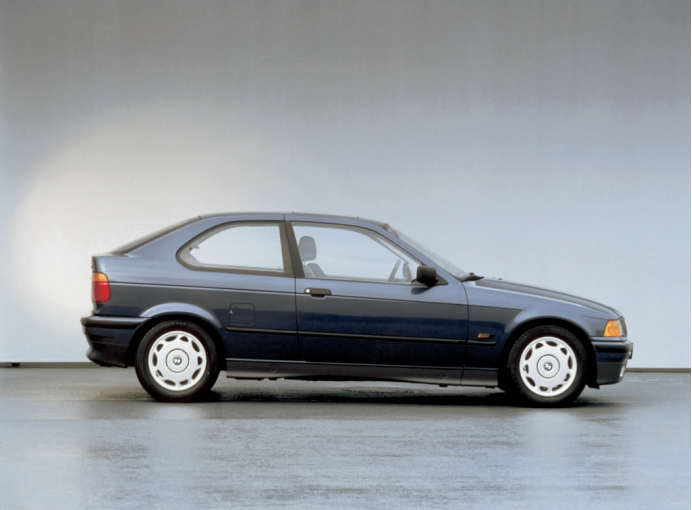 发布宝马的第三代3系,车架代号E36,它继承了1600-2、2002、E21、E30等数代演化后,到了E36时代已经迈向成熟,在与同级别车型(D-Segment)的竞争中也因为其独特的前置引擎后轮驱动布局所展现出的运动性能,要知道,在八九十年代里,D级的很多竞品已经开始转向那些即使没有太多电子设备辅助也能更容易驾驶的FF布局,能坚守FR且有点儿名气的品牌就剩下Mercedes和BMW,但C-Class略显老气横秋,BMW的三系便晋升为年轻中产们的不二之选,话虽如此,但随着E36相比于E30的体型进一步放大,而且价格也更为高昂,尤其在石油危机之后,对于当时年轻人们“上车盘”一类的选择,更多地会考虑例如C级车型,例如欧宝Astra、福特Escort、标致306、Lancia Delta、大众高尔夫这类前驱车,于是,宝马的工程师便尝试在E36基础上,缩减车身尺寸、配用四缸小排量引擎推出一款能与上述FF对手竞争的独立级别,而这就是后来1系、2系的始祖:E36 Compact。