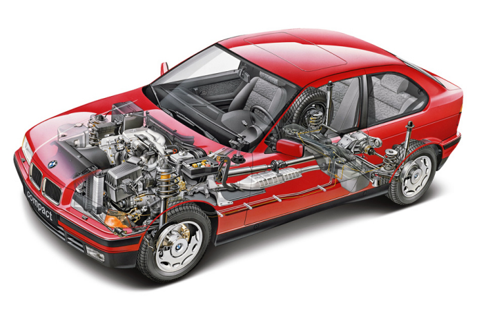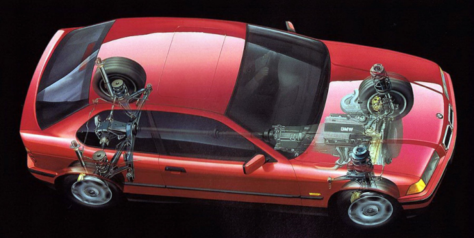 图:前悬挂与E36一样,采用麦弗逊形式;后悬挂则跟E30一样,采用半拖曳臂形式,这也导致部分车主会将发动机改成E30 M3的S14机器,不过这种悬挂也容易出现转向过度情况,娱乐性十足也是在年轻人中受欢迎的其中一个原因吧。