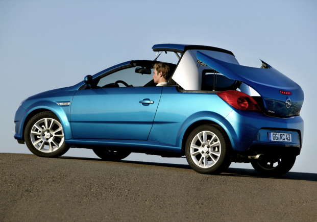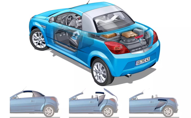 图:Tigra B的开蓬方式很特别,巧妙地将硬顶收入一个垂直的空间里,开蓬后,空间有250升、关蓬后有440升,再加一个70升的特殊空间,所以关蓬后总容积达到500升,在同级车型中难逢对手。