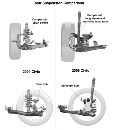8代思域的后避震有着更长的行程,以及这代车型上避震机和弹簧是分开放置的,而不是像7代思域那样采用一体式避震,一体式避震为了防止避震与车架互相干涉则需要用多点空间,机簧分离之后就不需要额外占用车内空间,让车内空间更宽广。另外悬挂上的羊角换成了铝合金材质,而不是之前的钢制。