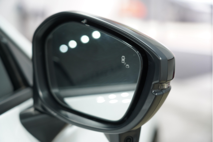 来到车侧部分,能看到有钢琴黑烤漆的后视镜盖以及门把手,这都是顶配车型独有的熏黑运动套件。后视镜上还能看到有车侧盲点检测的指示灯标识,以及集成一体的侧方转向灯。另外,在右后视镜下方能看到有一个摄像头,相信看到这会有读者问,这不是两厢顶配才有的LWC盲点检测摄像功能吗?两厢燃情版原装没有的吧。没错,原车上的确没有,该功能是车主通过后期原厂升级获得的,除了加入了摄像头之外,转向灯拨杆还更改了带有LWC功能激活按钮,使用起来的感觉就是:右侧路况不再迷糊。