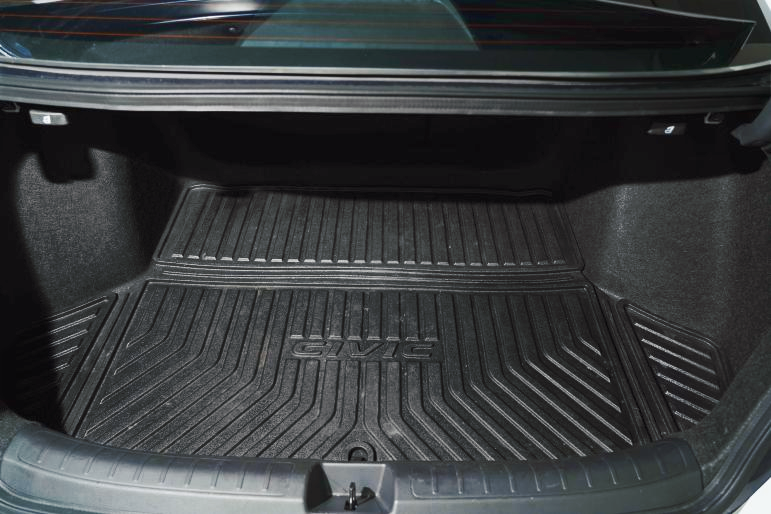 后备箱方面,原车带有印有Civic样式的盖板,打开盖板下方是非全尺寸备胎,以及对应的千斤顶和换胎工具。后备箱的开启方式有车辆牌照上方的电子开关,以及主驾驶车门的后备箱开启按钮。