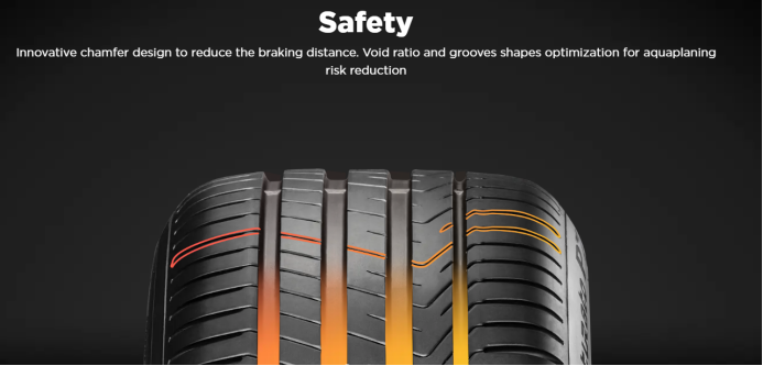胎纹部分,P7采用的是非对称式胎纹,因此胎面部分总共可分为外侧、中侧、内侧,三个区块。轮胎内侧胎块,主要负责在弯道时的抓地力,当然也需要有一定的排水性能,只是相对于外侧花纹,内侧并不需要那么厉害的排水性能。中间连贯性的胎纹,主要负责车辆直行时的抓地力和稳定性。外侧花纹板块主要负责排水性能。P7的轮胎中侧位置带有四条纵向排水槽,保证轮胎在湿地乃至蹚水的过程中,依旧有一定的抓地力表现,并且中间的胎块上还带有波浪型胎纹。内、中、外侧的胎块采用了特定节距顺序,保证轮胎的抓地力表现和磨损平均程度。