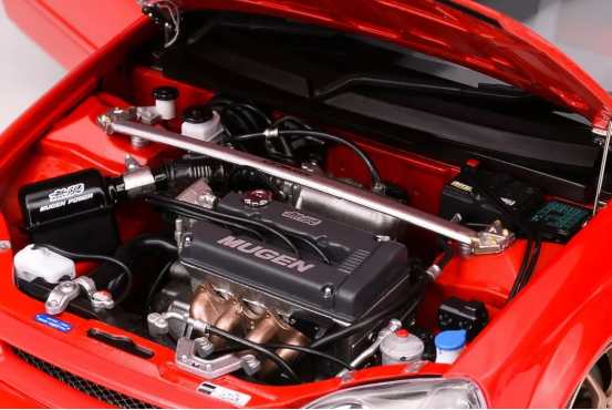 动力方面根据能够找到得到资料能够得知当年Mugen为这款车推出过整套进气套件、4合2合1排气焦(排气歧管)、运动中尾段排气、Mugen N1引擎ECU程序、加大散热水箱、油底壳等等。在MotorHelix的1/18模型上,这些改装件都得到复原。引擎本体还是那款B16发动机,只不过“盘头盖(气门室盖)”被喷成灰色,并印有“無限Mugen”字样。