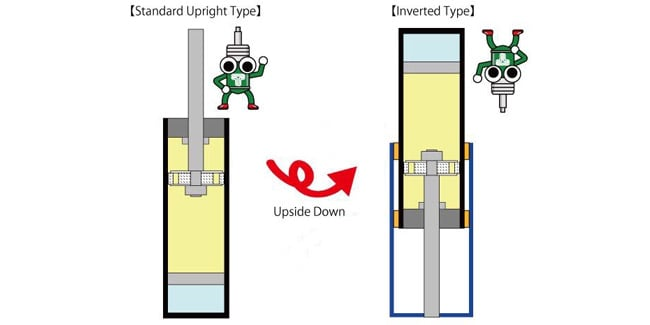 图:这是正插和倒插的示意图,倒插避震虽然能够提升更多的操控性能,但结构更复杂,质量也更重。