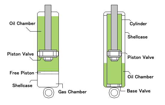 接着再来说按照避震机内部结构分类,分为单筒式和复筒式两种。单筒式减震机顾名思义只有一个主压力筒体,内部含有高压氮气和阻尼油(避震油)。其特点在于阻尼油能直接接触筒壁,散热面积大,抗热衰减性能好,并且高压气体能够直接作用于阻尼油,反应更迅速灵敏,能提供更线性的阻尼力。复筒式结构拥有两层桶身,分为内筒和外筒,阻尼油单独存在内筒中,外筒含有低压气体。当避震压缩到一定程度后,压力会打开内筒底部阀门将油压释放到外筒,减少避震出现打底现象,同时减少阻尼油因压力过大、热量产生气泡。因此,其特点在于拥有更长的使用寿命,同时拥有更长的减震行程,并且内部为低压设计,初始阻尼力相对柔和,对细微振动过滤较好。再来说一下两者的缺点,先说单筒式结构,第一,由于结构问题,其工作行程相对来说会短一点;第二,其舒适性会有所欠缺;第三,因为制造工艺和成本更高,所以最终售价会略高。再说一下复筒式结构,第一,因为中间隔了一层的关系,散热性能会差点;第二,对路况变化的反应相对较慢。