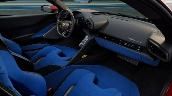 动力部分,沿用了源自SF90 Stradale的那套V8加三电机的动力总成,代号F154 FA的双涡轮增压3990cc排气量V8发动机更换了新的气缸盖、排气歧管和涡轮增压器,新涡轮尺寸是目前法拉利量产车型中最大的,以上改进让这台V8机器的最大马力输出从SF90上的780匹提升到819匹。电机部分,两台位于前轴的电机主要负责车辆在转弯时进行扭力矢量控制,因此仅能在时速低于209 kph下提供动力。第三台电机位于发动机与波箱之间,用于辅助提供动力,因此被设计为在发动机全功率输出段过程中保持工作状态。电机综合输出功率为160kW,电池组容量为7.45千瓦时,纯电续航里程约为24km,最高限速80 kph。传动部分,仅提供8速双离合波箱可选。